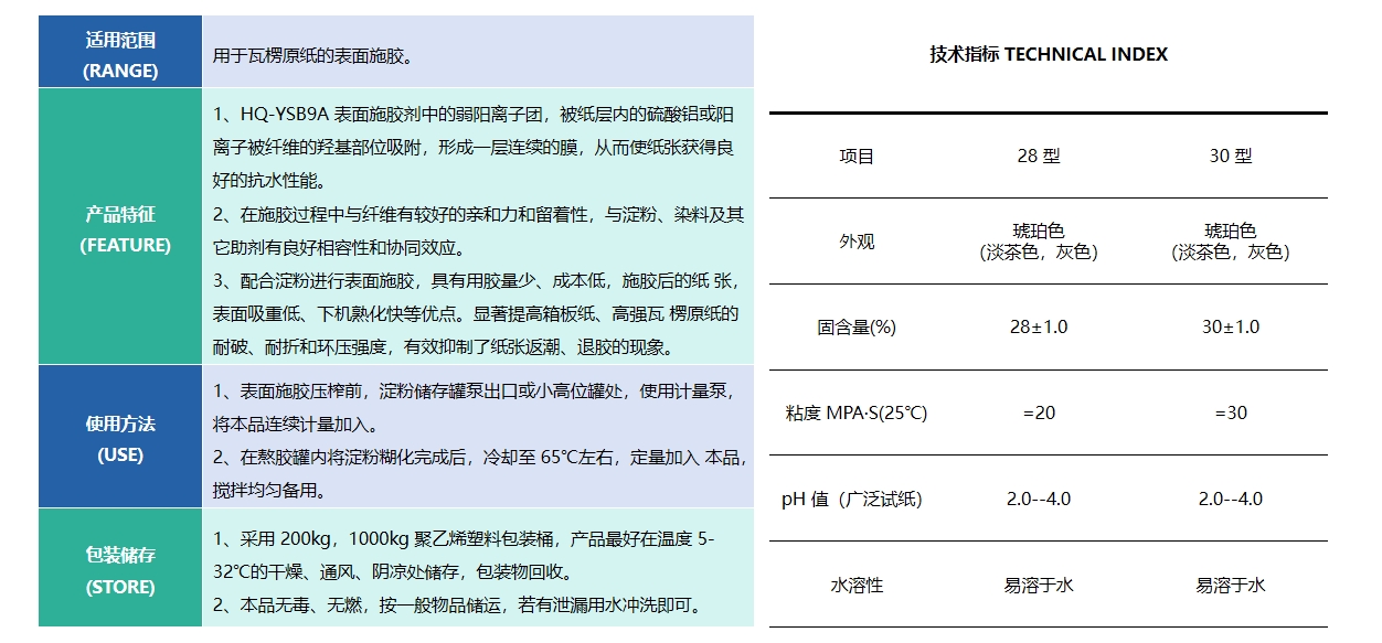 HQ-G6887 表面施膠劑,是苯乙烯-丙烯酸醋類的共聚合成的一種弱陽離子表面施膠劑,能與淀粉有機溶合,賦予淀粉涂層良好的交聯強度和疏水性能。無熟化期,可100%留著于紙上,集中發揮其施膠效果,獲得穩定的抗水性能,且高強瓦楞紙不回潮,環壓強度穩定不變。